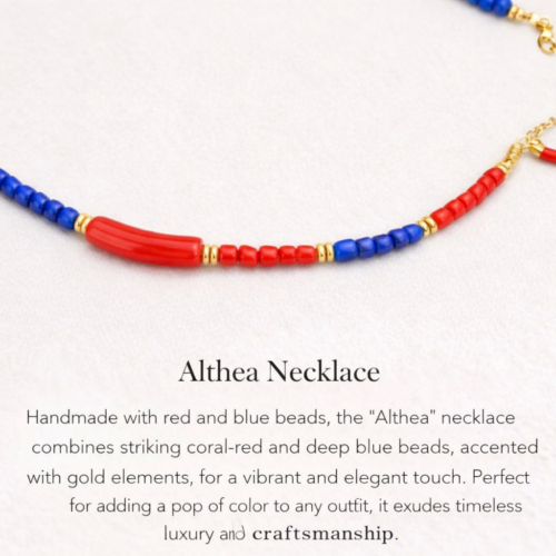 Χειροποίητο κολιέ με έντονες κόκκινες και μπλε χάντρες, διακριτικά χρυσά στοιχεία και μια σύγχρονη, κομψή αισθητική. Το Althea Necklace συνδυάζει χρώμα και φινέτσα με έναν τρόπο που ξεχωρίζει, δίνοντας χαρακτήρα τόσο σε καθημερινά όσο και σε πιο ιδιαίτερα looks. Ένα κόσμημα που φοριέται εύκολα μόνο του, αλλά κάνει αμέσως αισθητή την παρουσία του.