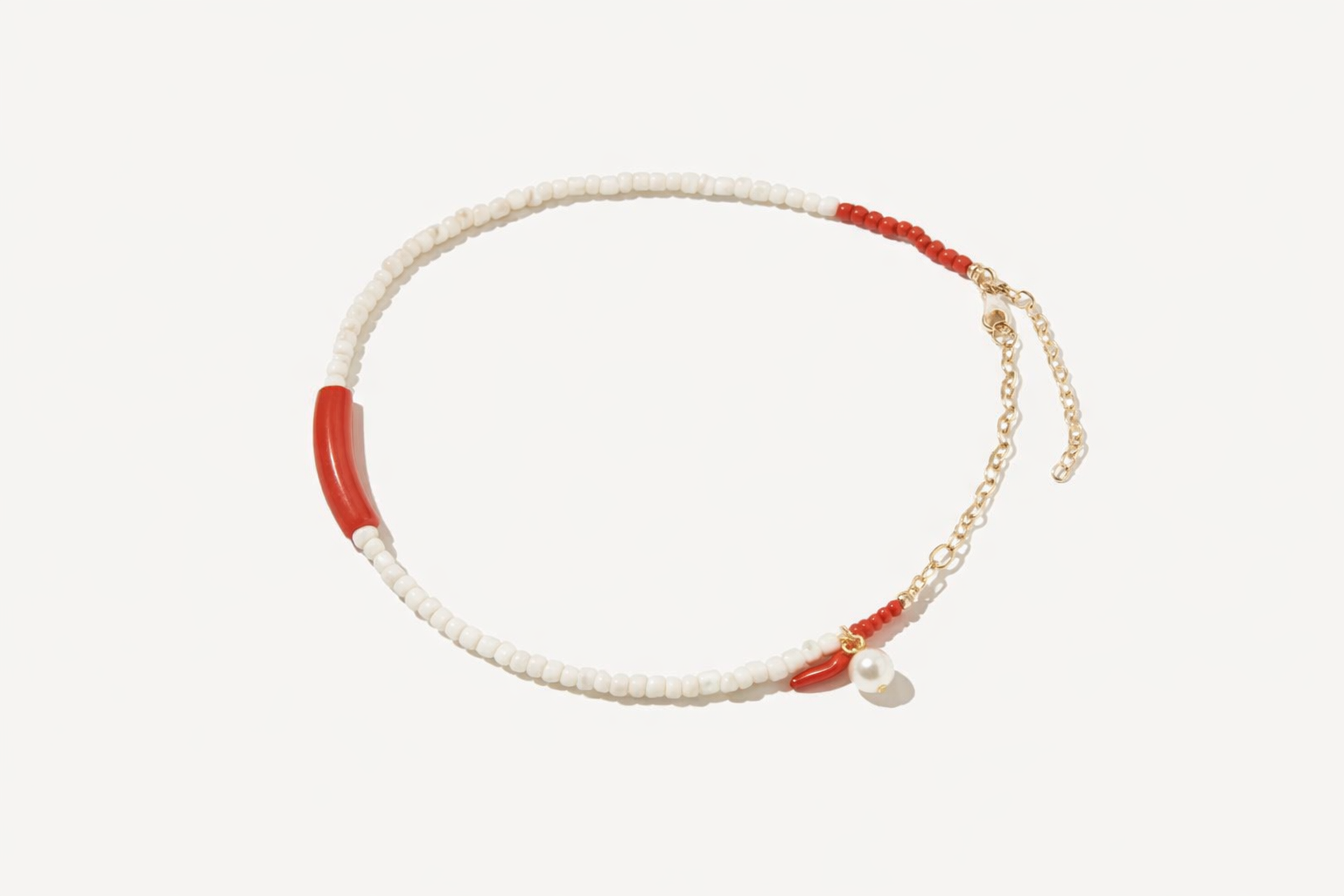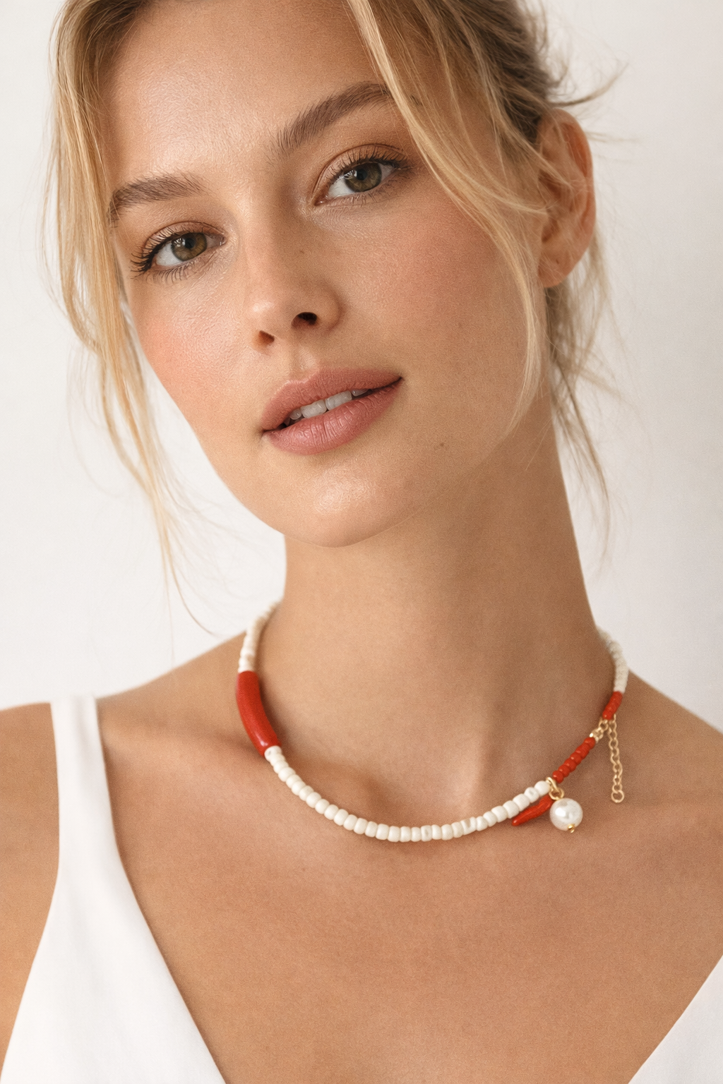 Ένα ιδιαίτερο χειροποίητο κολιέ που συνδυάζει τη διαχρονική κομψότητα με μια πιο καλοκαιρινή, φωτεινή αισθητική. Οι λευκές χάντρες δένουν αρμονικά με τις κόκκινες λεπτομέρειες, ενώ το διακοσμητικό στοιχείο με πέρλα και κοραλλί charm χαρίζει έναν ξεχωριστό, elegant χαρακτήρα.