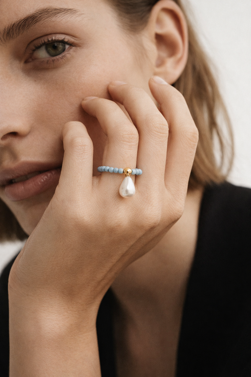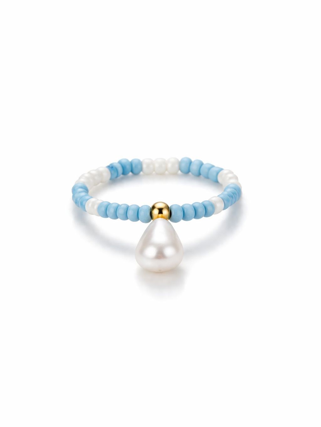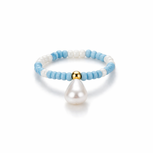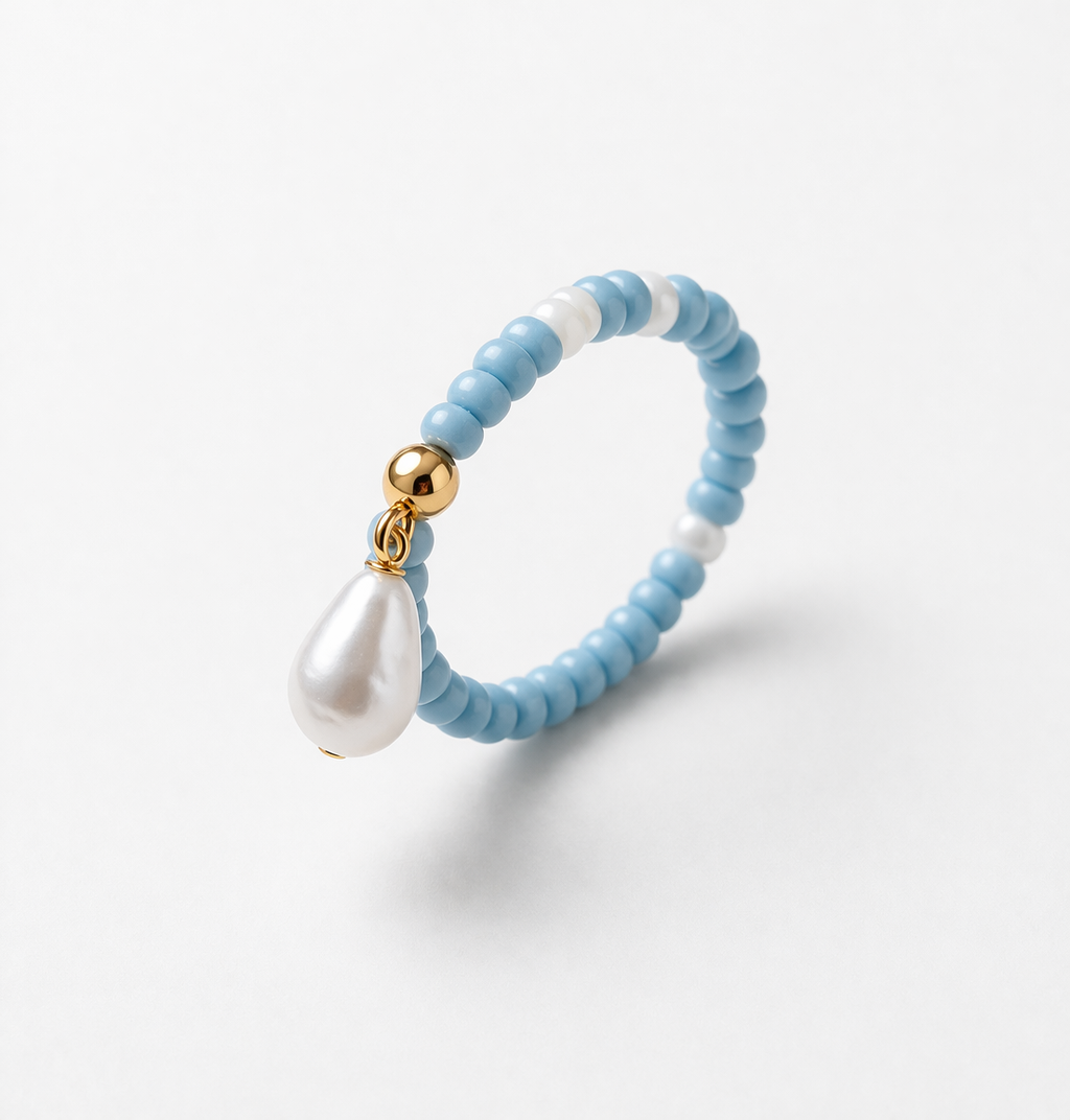 Χειροποίητο δαχτυλίδι με λεπτές χάντρες σε γαλάζιες και λευκές αποχρώσεις, διακοσμημένο με χρυσή λεπτομέρεια και κρεμαστό στοιχείο σε σχήμα πέρλας. Ένα ιδιαίτερο κόσμημα με φίνα, καλοκαιρινή αισθητική που χαρίζει διακριτική κομψότητα σε κάθε εμφάνιση.