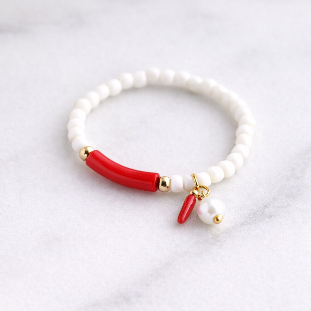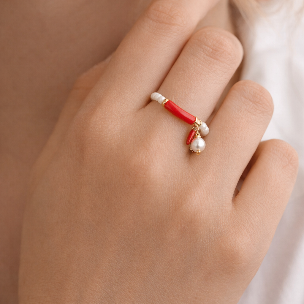 Χειροποίητο δαχτυλίδι με λευκές χάντρες, έντονη κόκκινη λεπτομέρεια στο κέντρο και χρυσές πινελιές που χαρίζουν φωτεινότητα και κομψότητα. Το μικρό charm με πέρλα και κόκκινο στοιχείο προσθέτει μία ιδιαίτερη, παιχνιδιάρικη αλλά και θηλυκή αισθητική, κάνοντας το κόσμημα να ξεχωρίζει σε κάθε εμφάνιση.