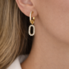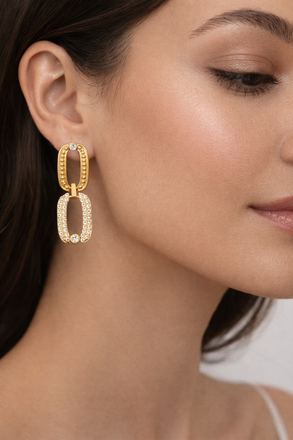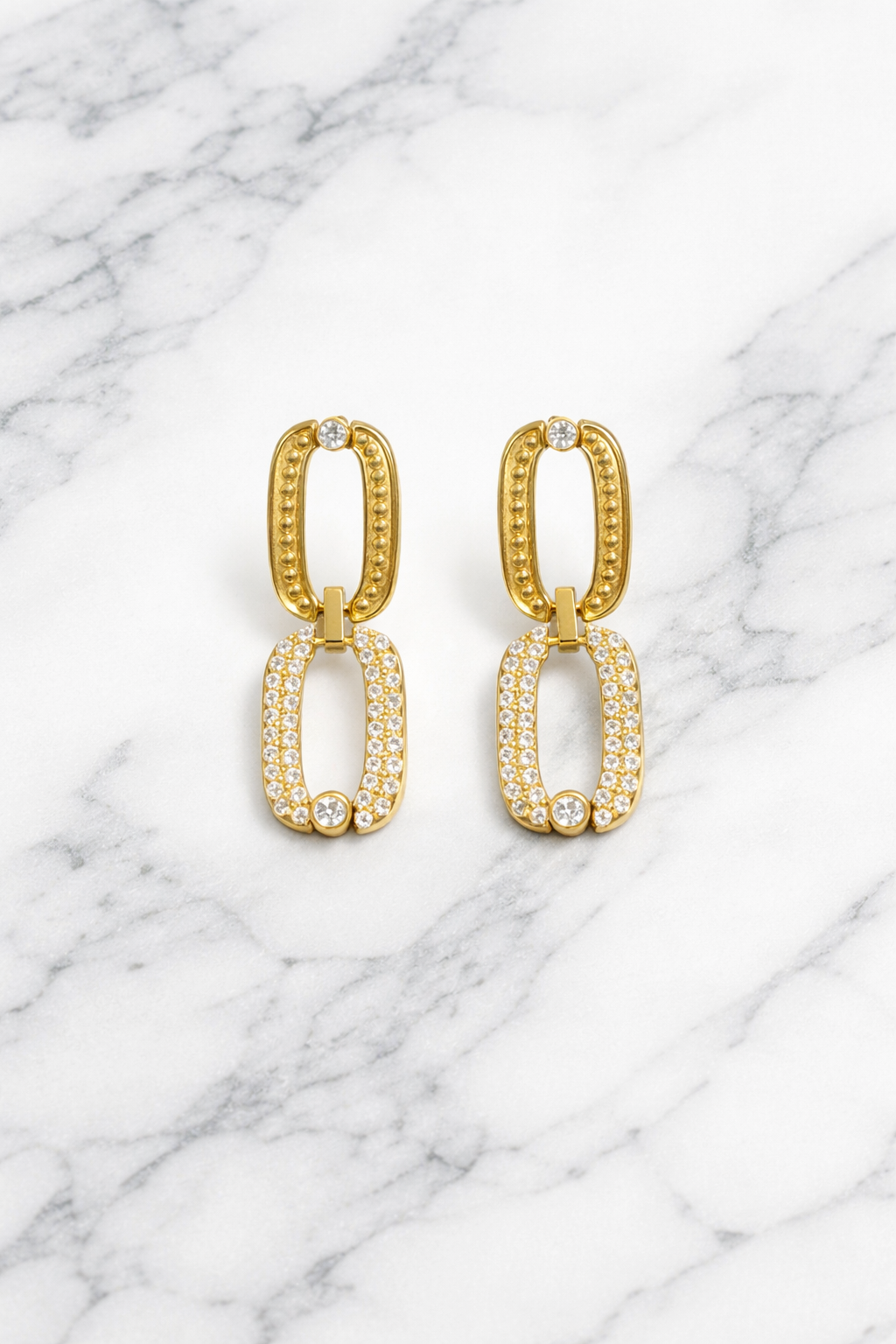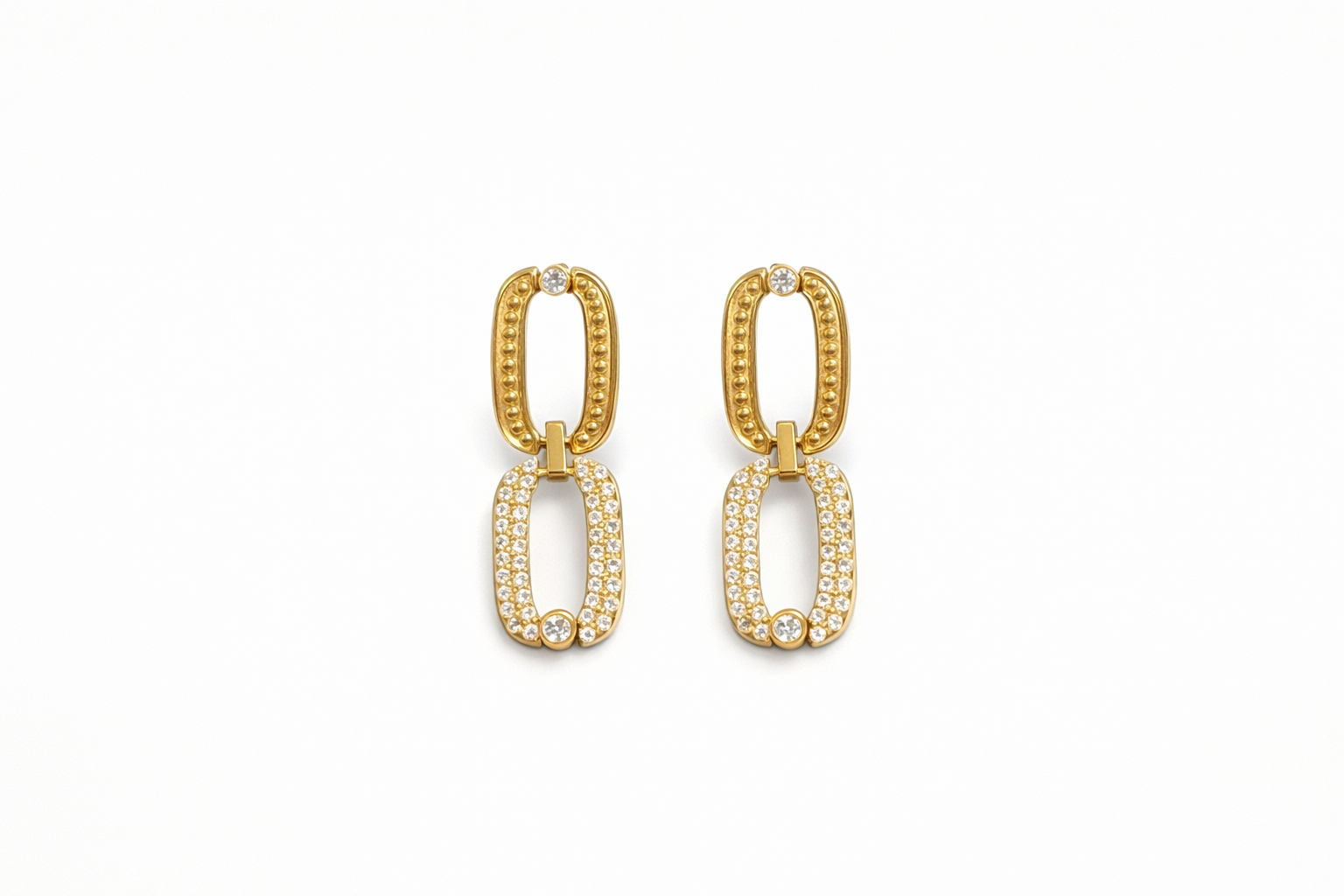 Αναβάθμισε κάθε εμφάνιση με αυτά τα εντυπωσιακά σκουλαρίκια από stainless steel, σε ζεστή χρυσή απόχρωση. Το διπλό οβάλ σχέδιο συνδυάζει ανάγλυφη υφή στο επάνω μέρος και λαμπερά zircon stones στο κάτω, δημιουργώντας ένα elegant αλλά μοντέρνο αποτέλεσμα.