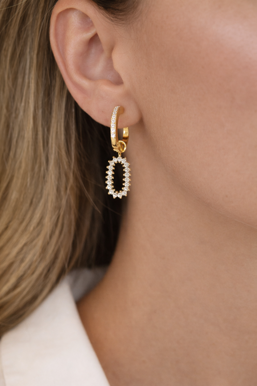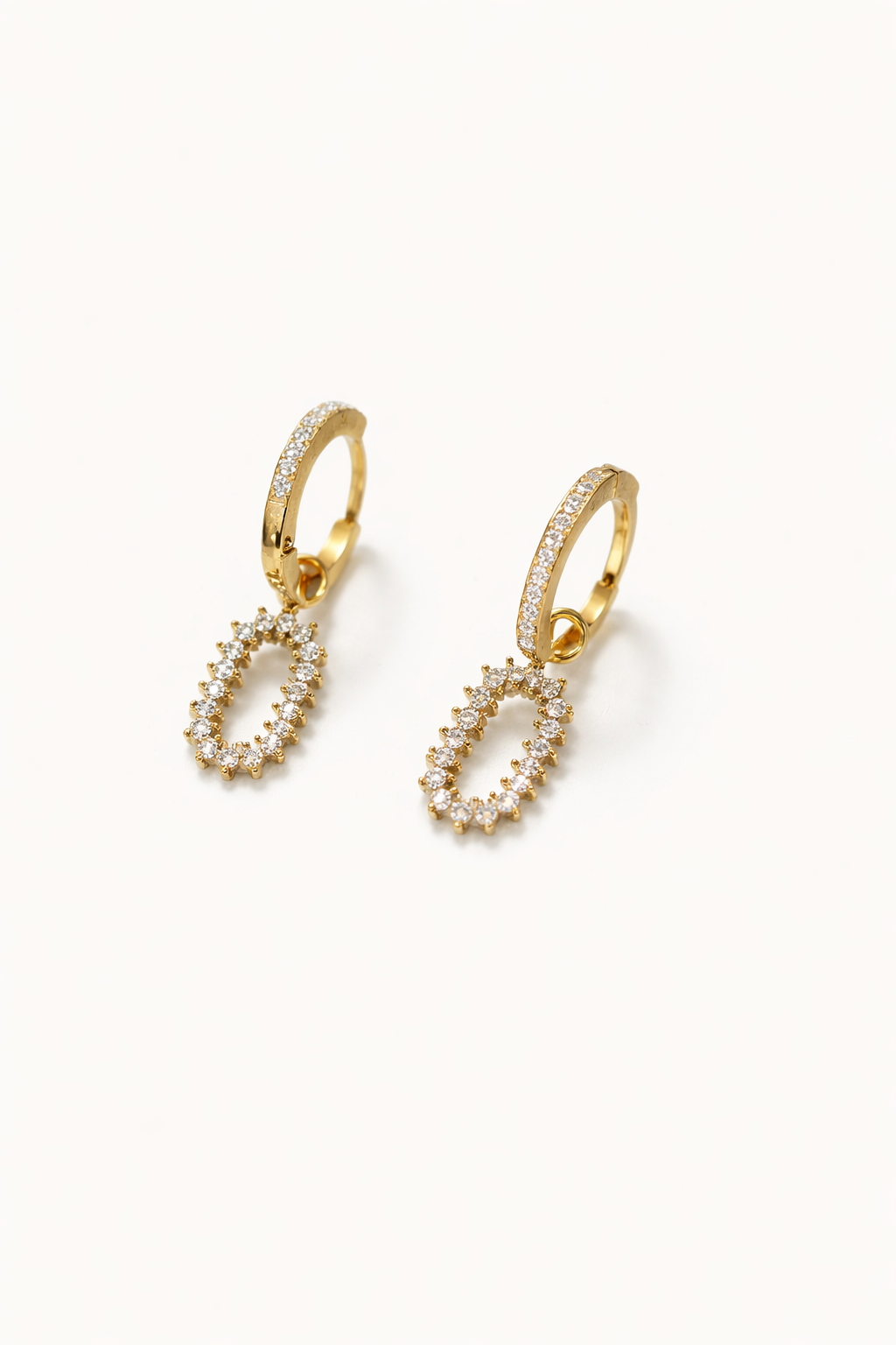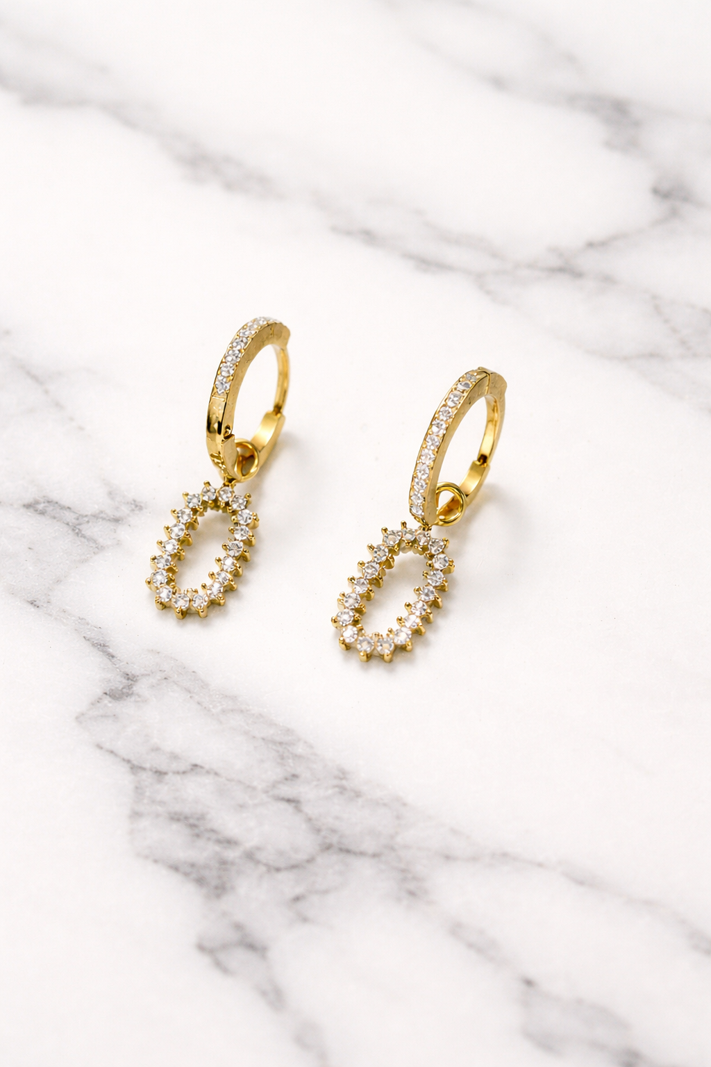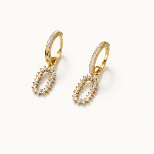 Κομψά και διαχρονικά σκουλαρίκια που συνδυάζουν τον minimal κρίκο με ένα εντυπωσιακό οβάλ κρεμαστό στοιχείο, διακοσμημένο με λαμπερές πέτρες. Ο χρυσός τόνος τους προσθέτει ζεστασιά και πολυτέλεια, ενώ ο διακριτικός σχεδιασμός τα καθιστά ιδανικά τόσο για καθημερινές εμφανίσεις όσο και για πιο ιδιαίτερες περιστάσεις.