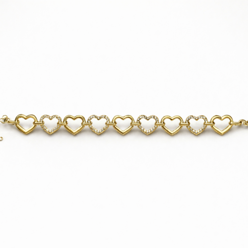 Κομψό και διαχρονικό, αυτό το χρυσό βραχιόλι με καρδιές είναι η ιδανική επιλογή για καθημερινές αλλά και πιο ιδιαίτερες εμφανίσεις. Αποτελείται από εναλλασσόμενες καρδιές σε γυαλιστερό φινίρισμα και καρδιές διακοσμημένες με λαμπερά ζιργκόν, προσφέροντας διακριτική λάμψη και ρομαντικό χαρακτήρα.