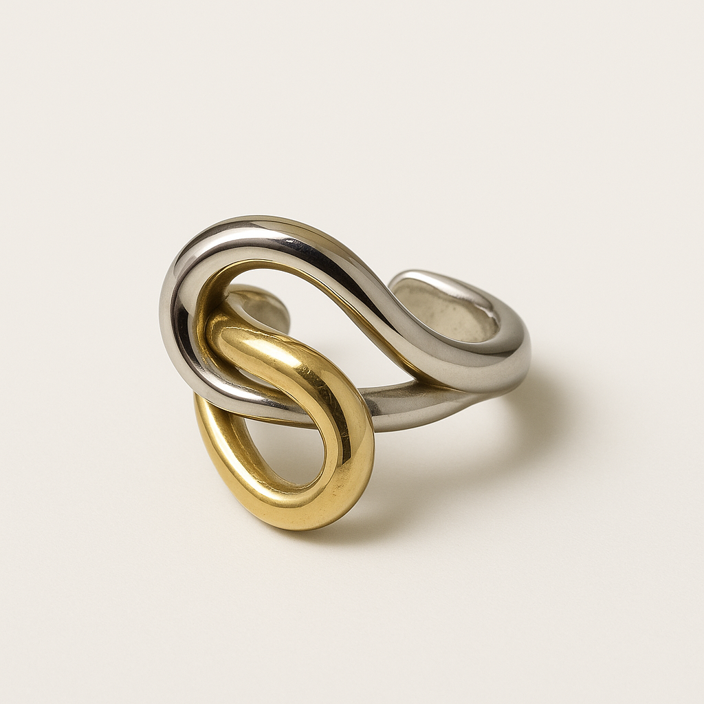 Ένα εντυπωσιακό δαχτυλίδι με μοντέρνο σχεδιασμό, που συνδυάζει αρμονικά το ασημί με το χρυσό σε μια μοναδική, πλεγμένη φόρμα. Η ιδιαίτερη καμπύλη του το καθιστά statement κομμάτι, ιδανικό για όσους αγαπούν τα minimal αλλά ταυτόχρονα ξεχωριστά κοσμήματα.