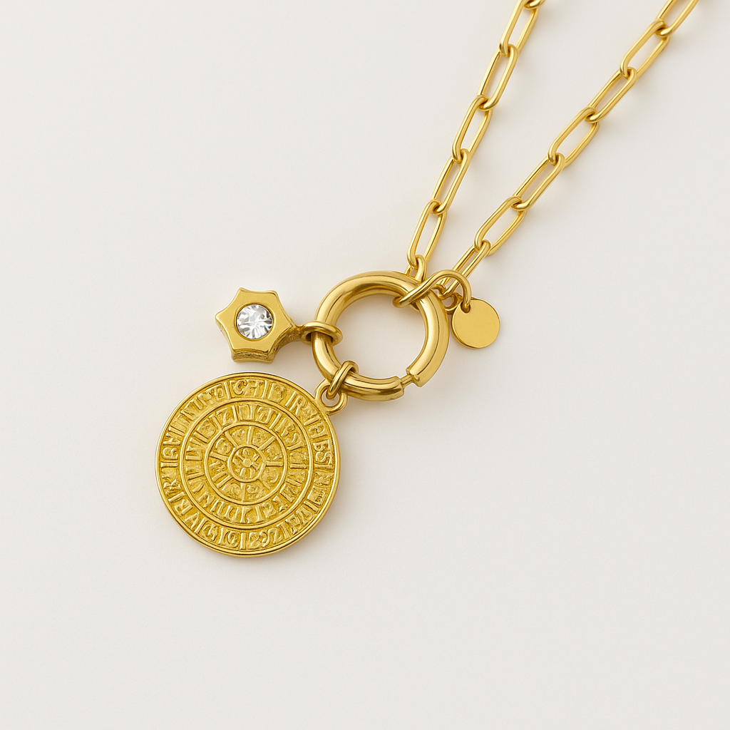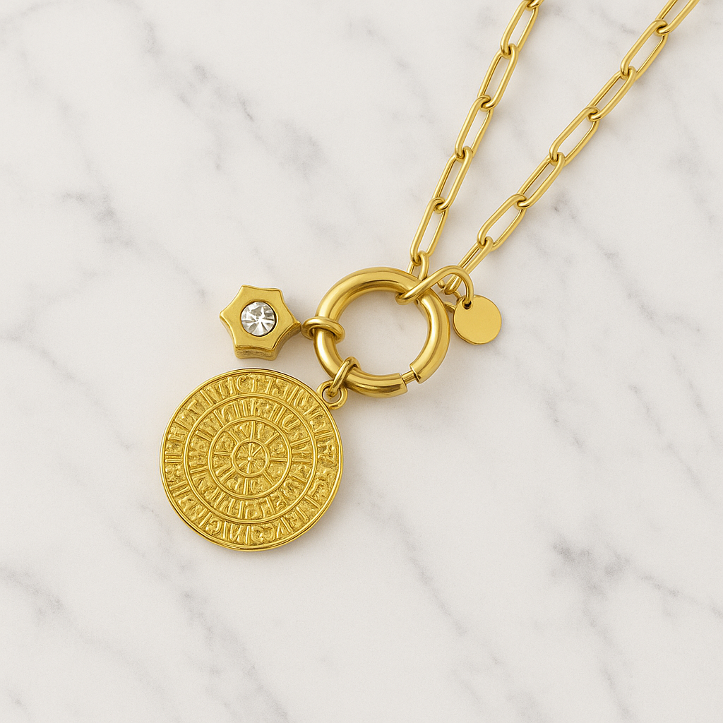 Αναδείξτε το στυλ σας με αυτό το κομψό χρυσό κολιέ, που συνδυάζει minimal αλυσίδα με δύο ιδιαίτερα μενταγιόν: