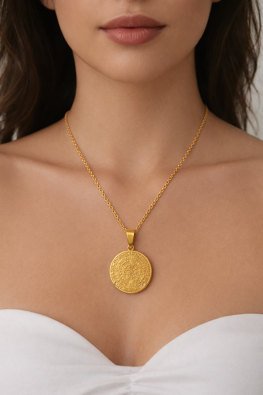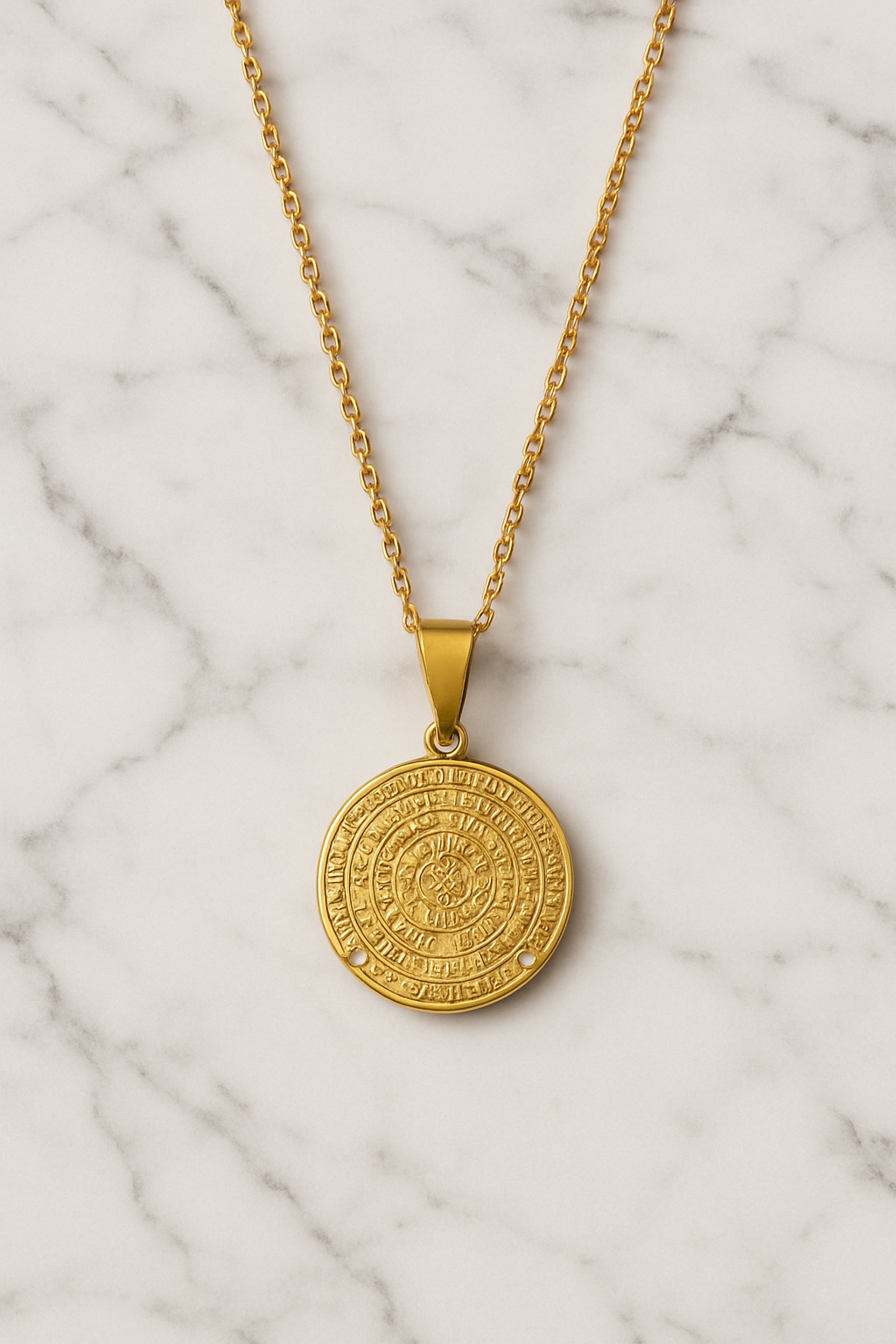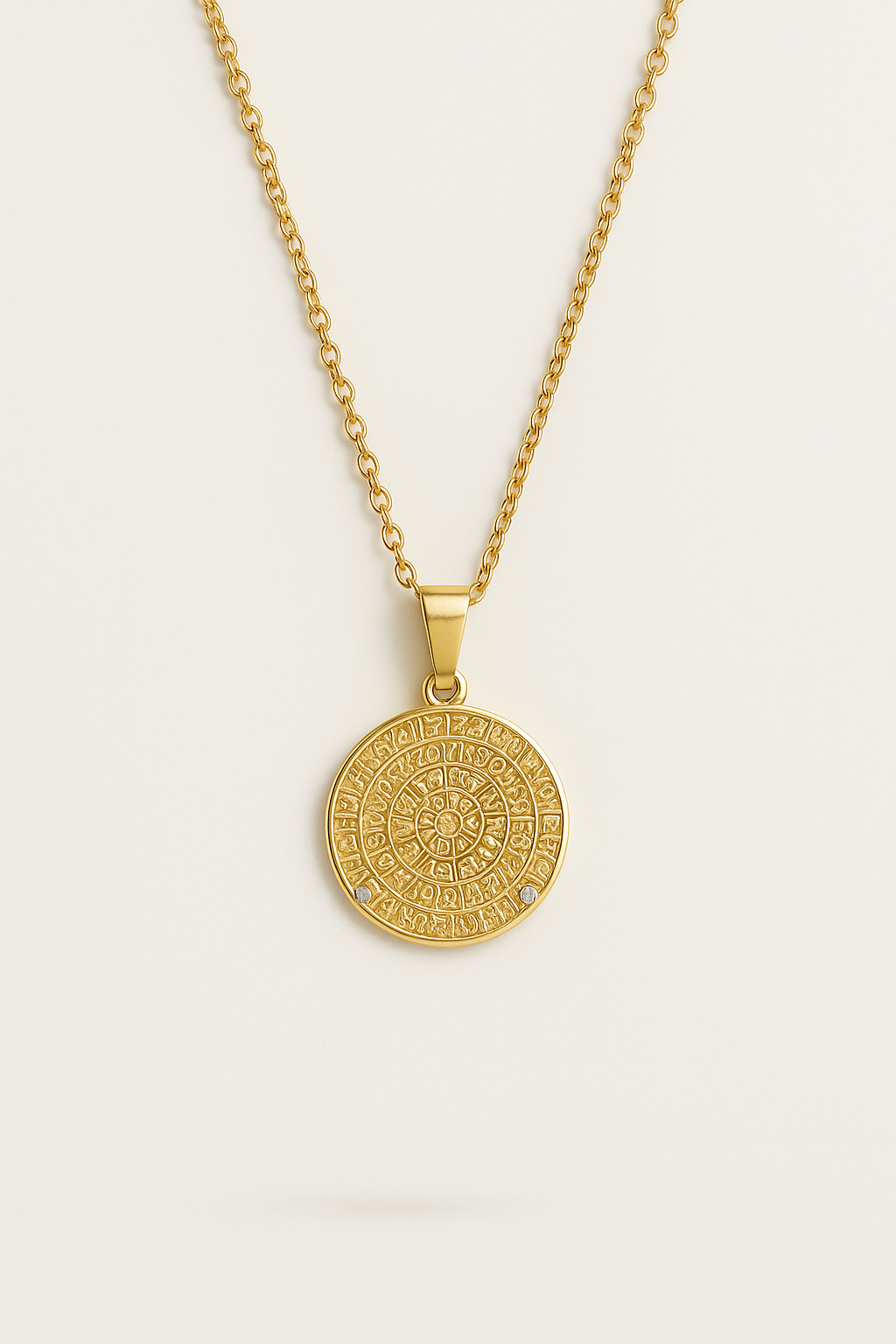Αναδείξτε το στυλ σας με αυτό το εντυπωσιακό χρυσό κολιέ, εμπνευσμένο από τον Δίσκο της Φαιστού. Το μενταγιόν διαθέτει λεπτομερή αποτύπωση του ιστορικού συμβόλου, προσφέροντας έναν μοναδικό συνδυασμό κομψότητας και πολιτιστικής κληρονομιάς.