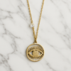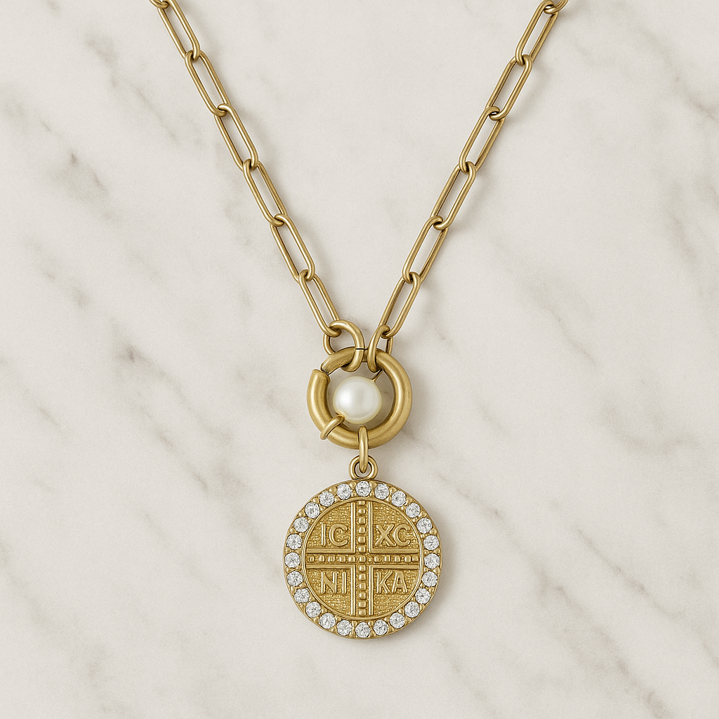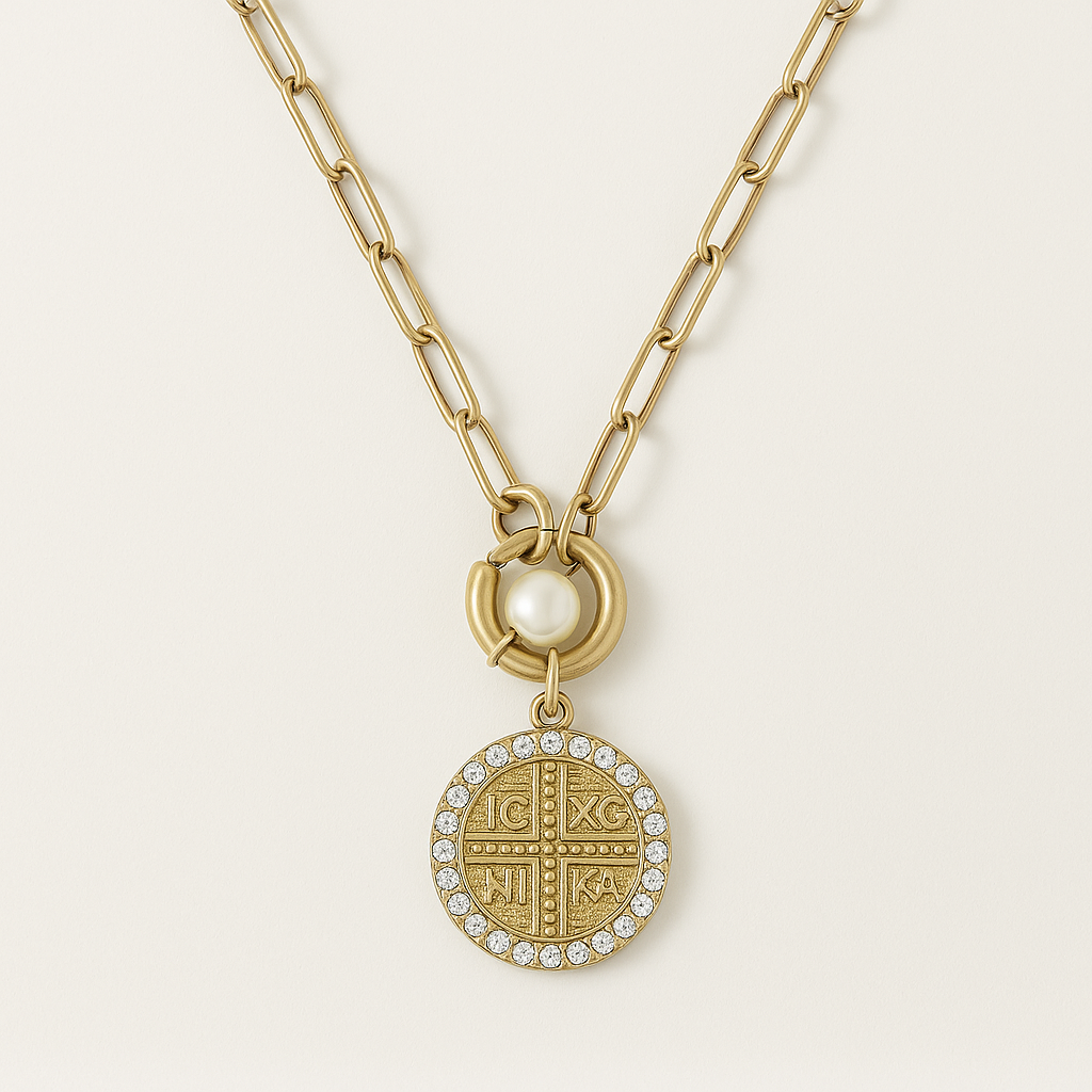 Κομψό κολιέ με αλυσίδα τύπου paperclip και εντυπωσιακό μενταγιόν σε στρογγυλό σχήμα. Το μενταγιόν είναι διακοσμημένο με το σύμβολο ICXC NIKA, λεπτομέρειες σε χρυσό τόνο και περίγραμμα με λαμπερά κρυστάλλινα στοιχεία. Το σχέδιο ολοκληρώνεται με μια κομψή λευκή πέρλα κοντά στο κούμπωμα, προσφέροντας διακριτική πολυτέλεια.