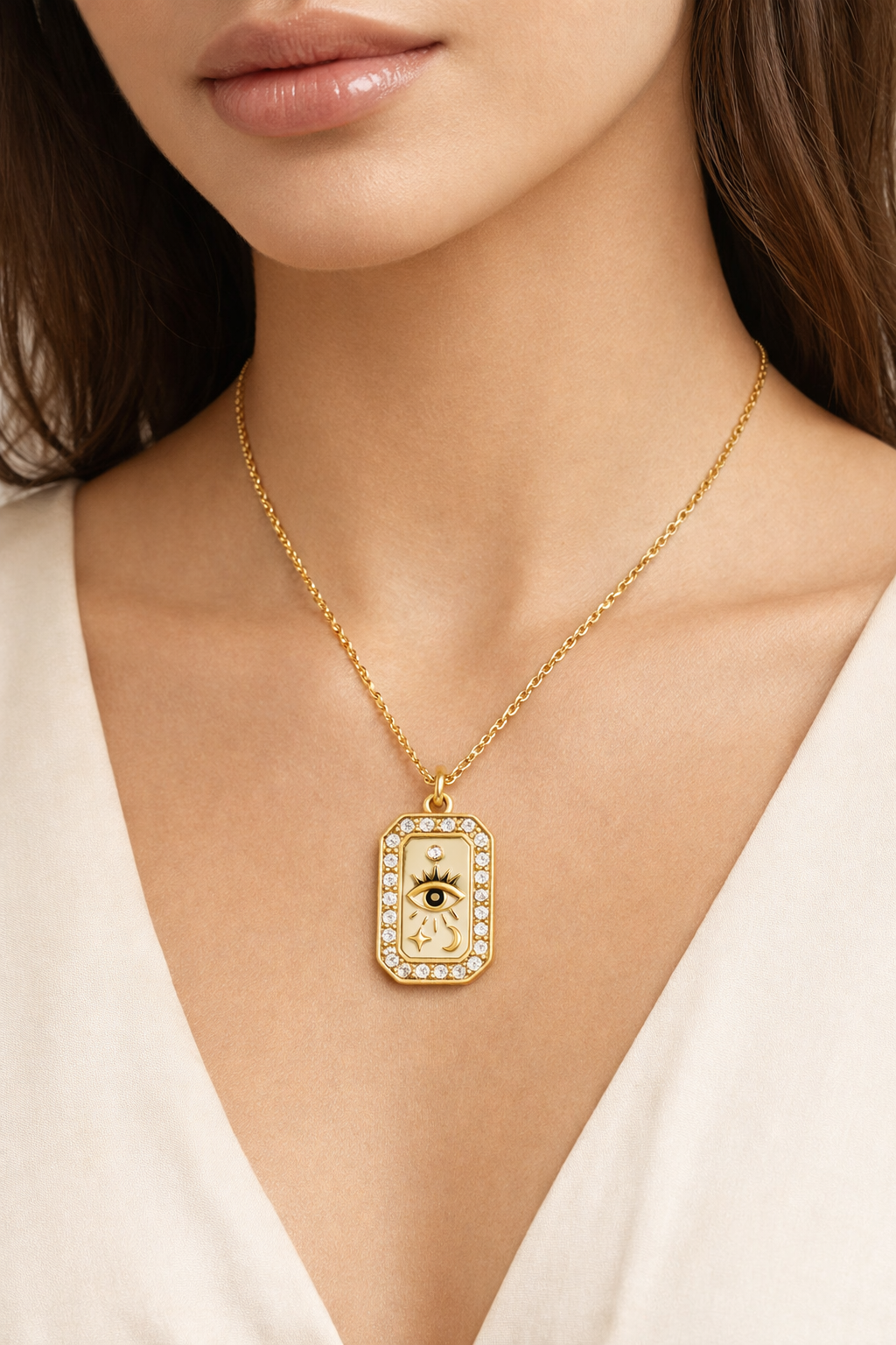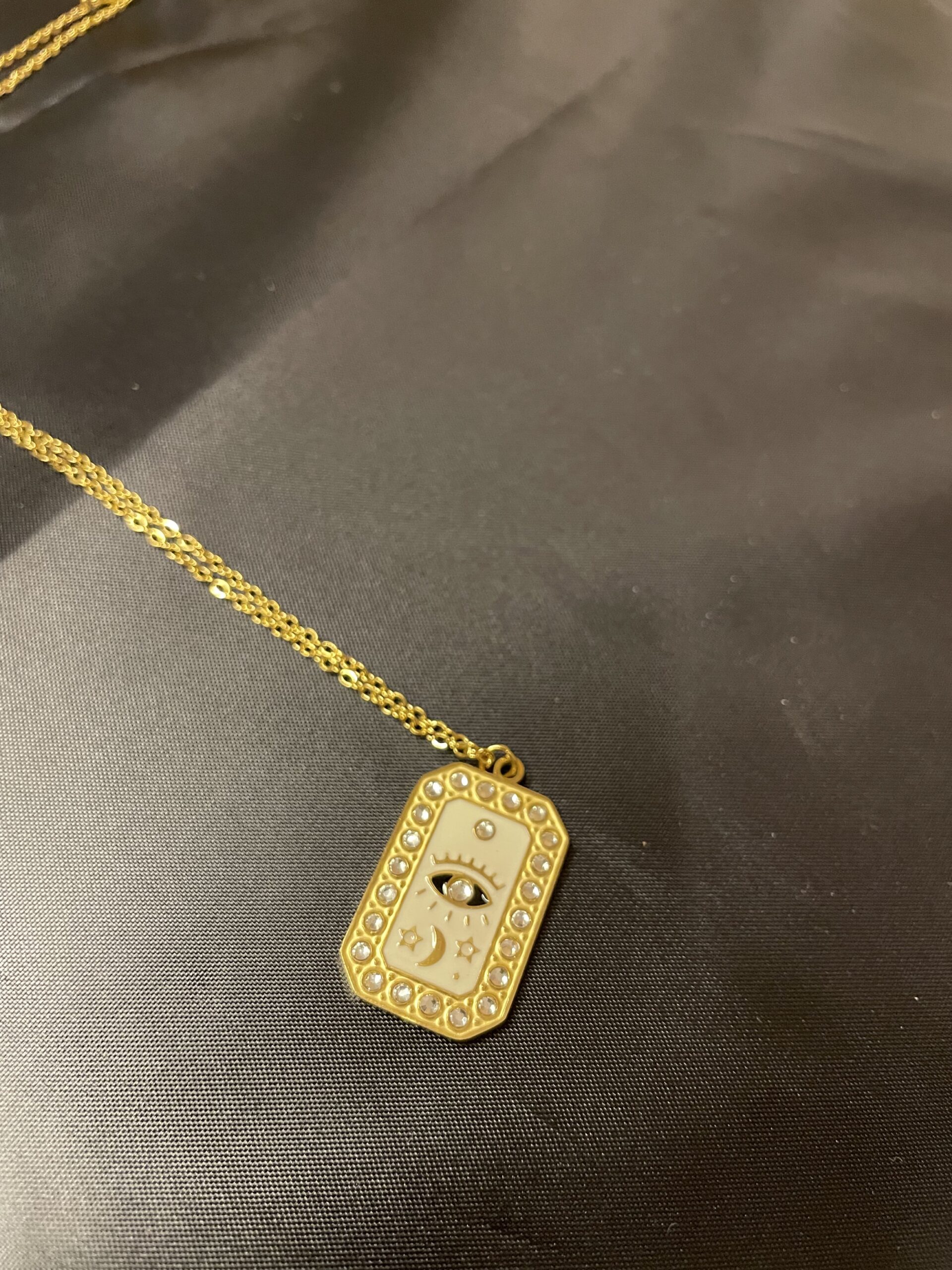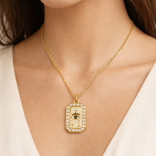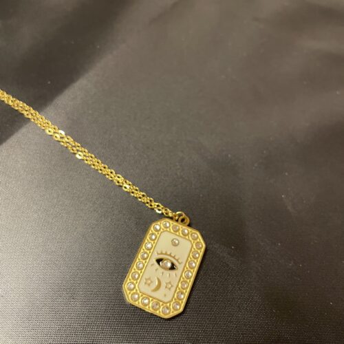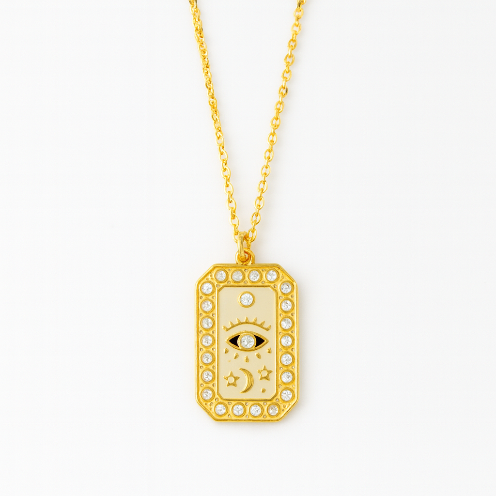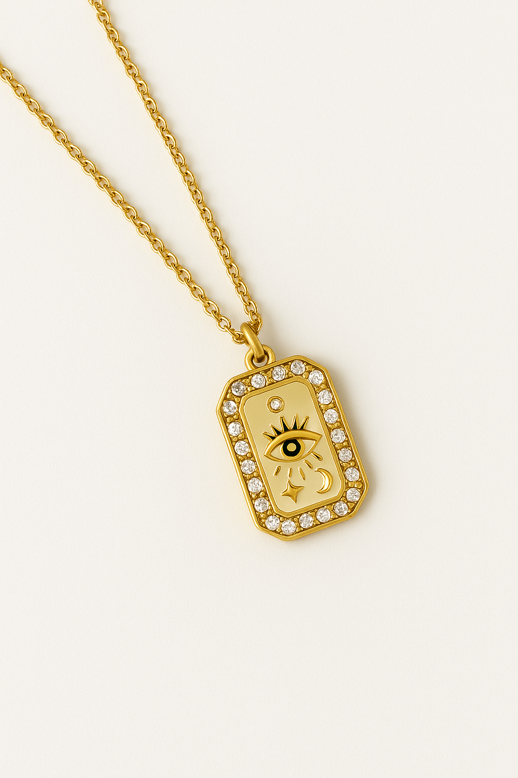 Χρυσό κολιέ με ορθογώνιο μενταγιόν, διακοσμημένο με λευκά κρύσταλλα και σχέδιο ματιού με αστέρια και φεγγάρι. Κομψό και εντυπωσιακό, ιδανικό για να δώσει μια ξεχωριστή πινελιά σε κάθε εμφάνιση.