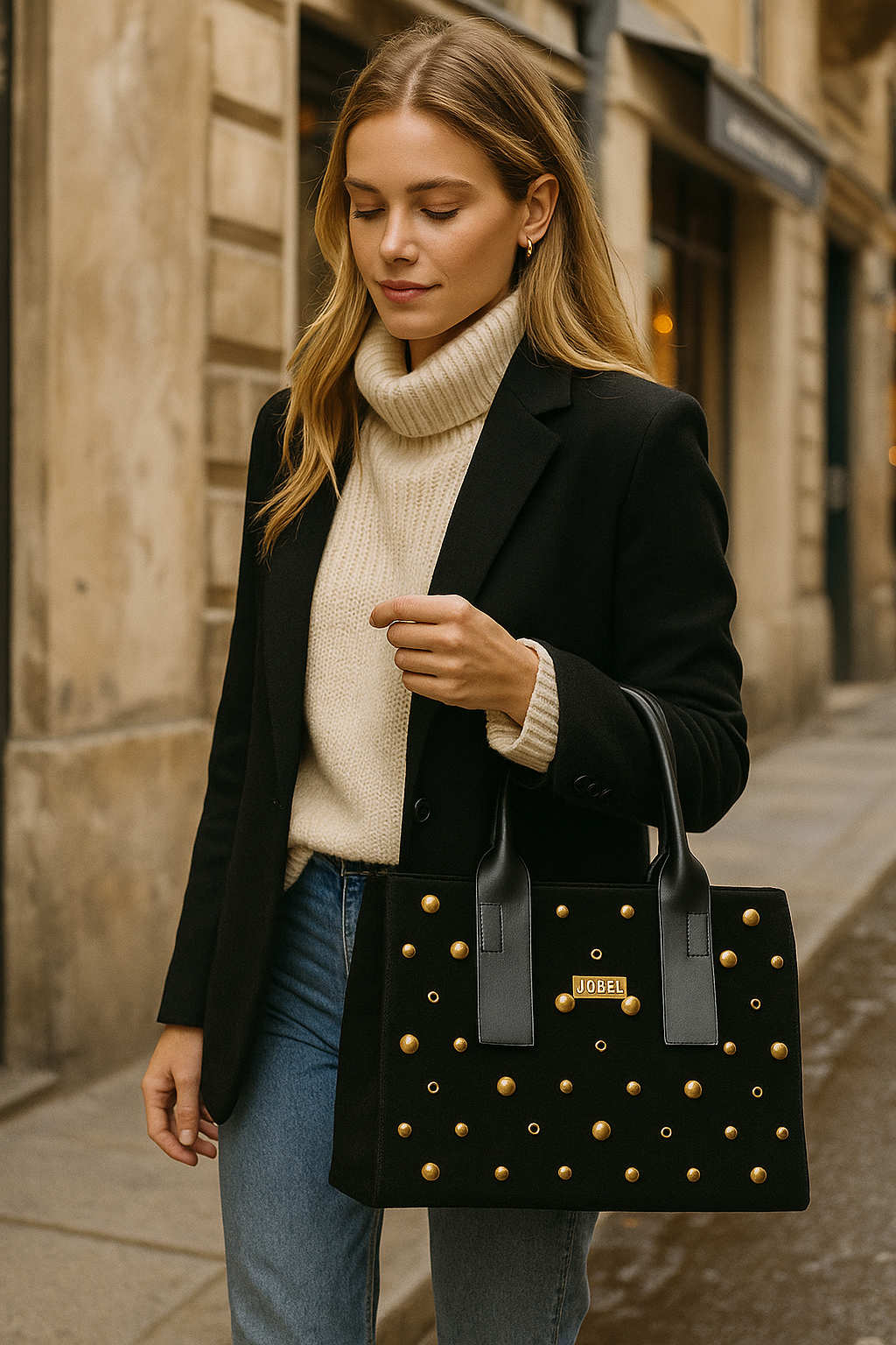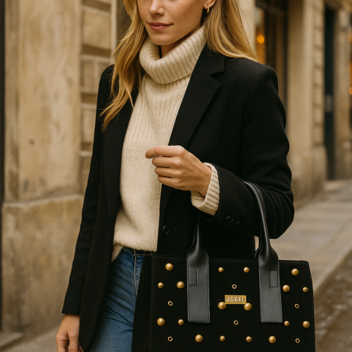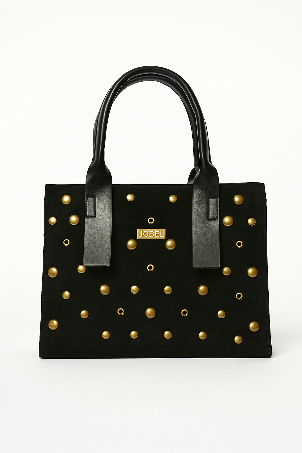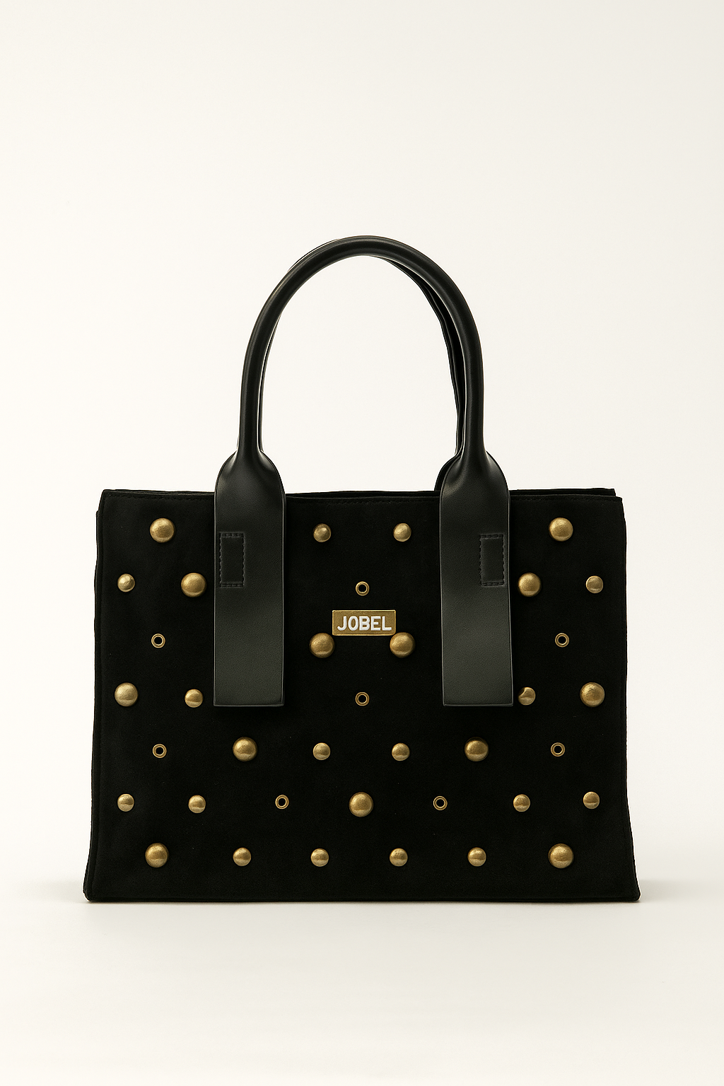 Ανακάλυψε την απόλυτη ισορροπία ανάμεσα στην κομψότητα και το urban στυλ με τη νέα τσάντα χειρός JOBEL σε απόχρωση black. Κατασκευασμένη από ποιοτικό suede υλικό, διακοσμημένη με μεταλλικά χρυσά studs σε διαφορετικά μεγέθη, χαρίζει δυναμισμό και πολυτέλεια σε κάθε εμφάνιση.