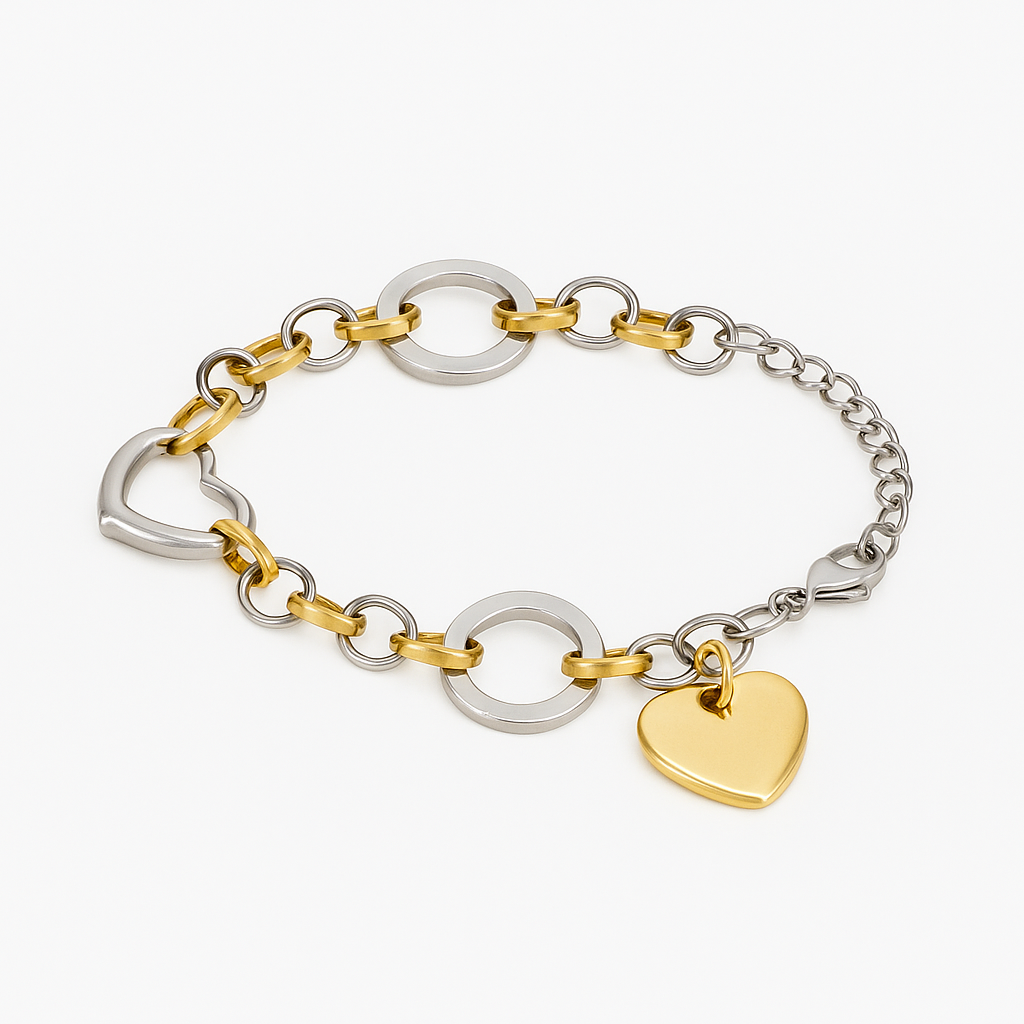 Αναδείξτε το στυλ σας με αυτό το εντυπωσιακό δίχρωμο βραχιόλι. Ο συνδυασμός ασημί και χρυσών κρίκων δημιουργεί μια μοντέρνα αλλά και διαχρονική αισθητική, ενώ τα διακοσμητικά στοιχεία σε σχήμα καρδιάς προσθέτουν μια ρομαντική πινελιά.